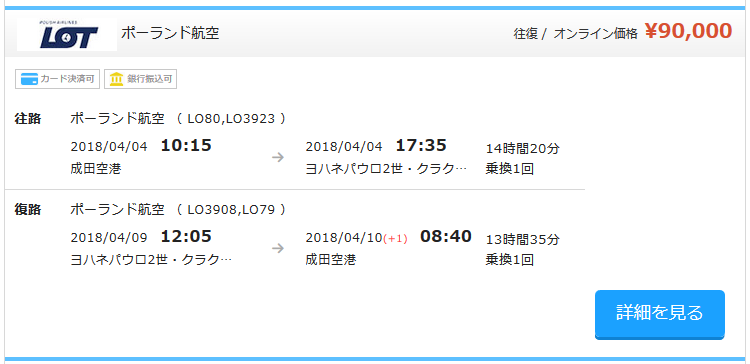 LOTポーランド航空の航空券代は90,000円で、スカイチケットを利用して予約しました。