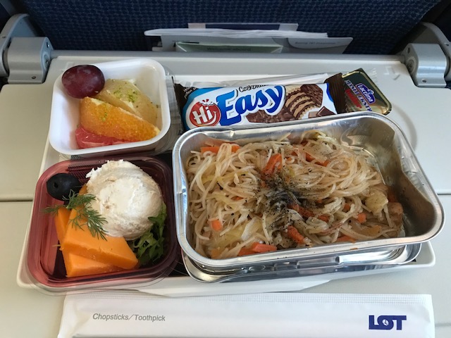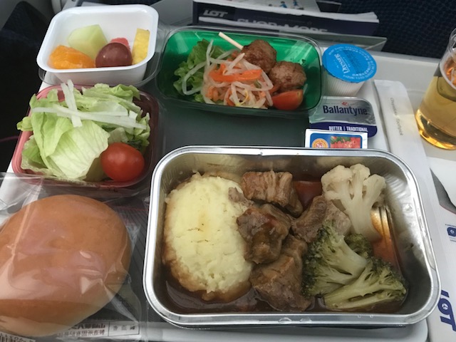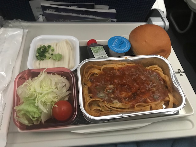 機内食は片道2回で、肉や魚はあんまり美味しくなかった。