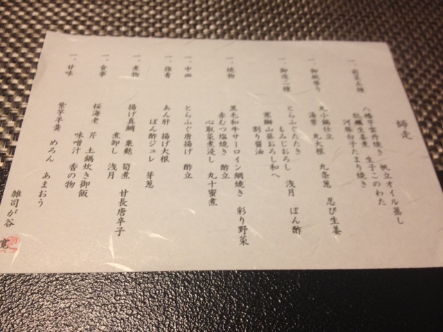 和食のコースはフレンチやイタリアンと違ってトリュフ、フォアグラ、キャビアと言った高級食材を使わないので、お腹がはちきれる程食べてもお代が高くつかないのが良いです。