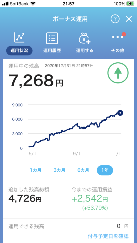 ボーナスは自動的に運用に回る設定をしていたのですが、4,726円も貰えているとは思いませんでした。