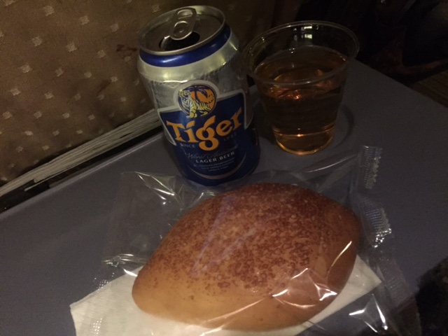 シンガポール航空SQ635便は羽田空港を22時55分に出発し、機内食は24時くらいの夕食と6時くらいの朝食の2回。
