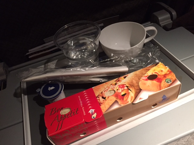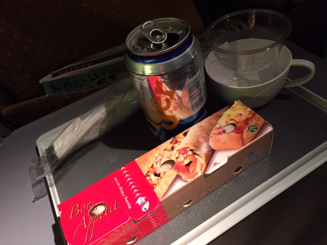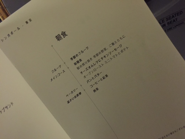 シンガポール航空SQ638便はシンガポールチャンギ空港を23時55分に出発し、機内食は25時くらいの軽食と7時くらいの朝食の2回。