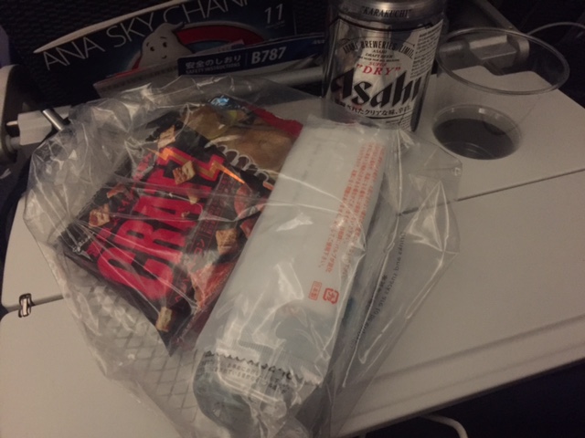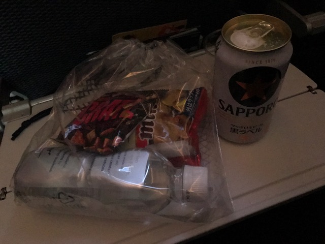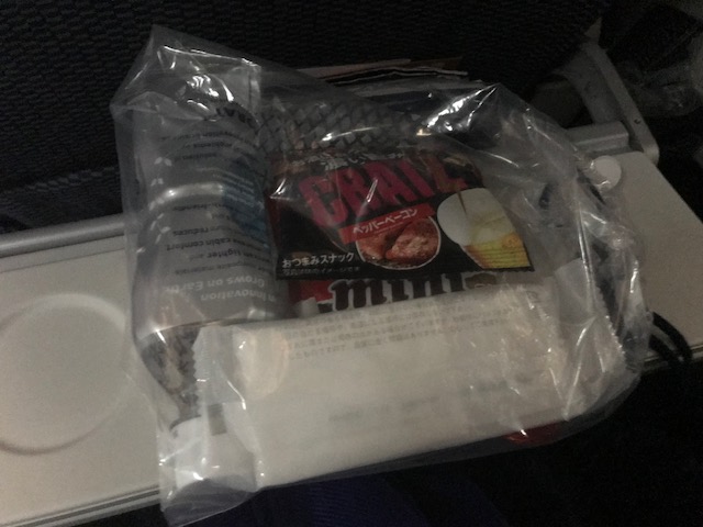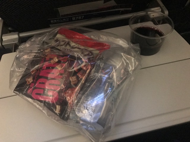 NH843便は羽田を0時10分に離陸し、シンガポールに6時35分(現地時間)に到着する便で、離陸後安定飛行になったらお菓子と飲み物が配られました。