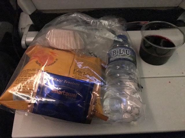 搭乗後に配られるお水とポテトチップスと不味そうなパン。